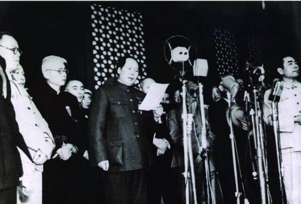 1949年10月1日、下午3时,北京30万群众齐集天安门广场,举行隆重的开国大典。毛泽东主席在天安门城楼上向全世界庄严宣告:"中华人民共和国中央人民政府今天成立了!”向世界宣告中华人民共和国成立。