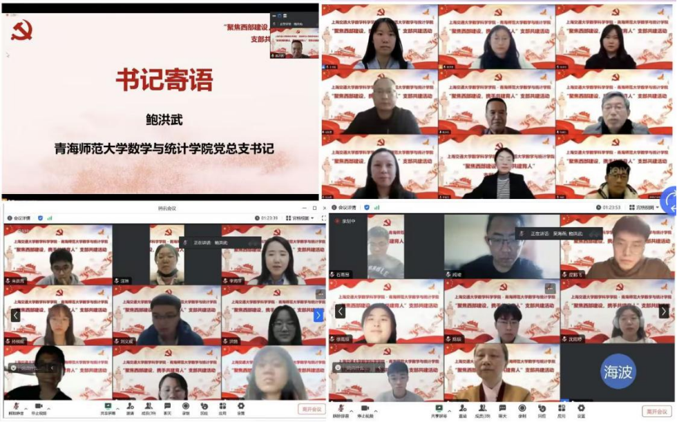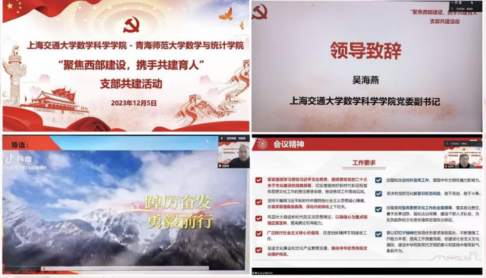 12月5日下午,为了促进资源共享、党建共建、学科共促、人才共育,3377体育与上海交通大学数学科学公司联合开展“聚焦西部建设,携手共建育人”支部共建活动,此次活动在线上举行,上海交通大学数学科学公司教师党支部、博士生党支部和公司教师党支部的党员参加活动,会议由上海交通大学数学科学公司员工党建指导老师滕旻缘同志主持。