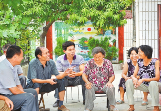 图为李连成(左二)与村民共话新村蓝图