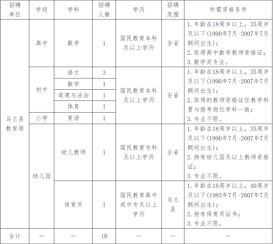 为顺利推进高考综合改革工作,学前教育普及普惠,持续推动乌兰教育高质量发展,现决定面向社会公开招聘编外教师10名。现将有关事宜公告如下: