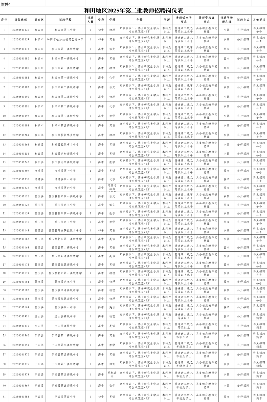 根据《关于做好2025年中小学教师公开招聘工作的通知》(新教函〔2025〕353号)和《关于进一步改进和完善自治区中小学幼儿园教师公开招聘工作的通知》(新教厅〔2022〕73号)文件精神,按照公开、平等、竞争、择优的原则,和田地区2025年面向社会公开招聘81名教师。现就有关事项公告如下: