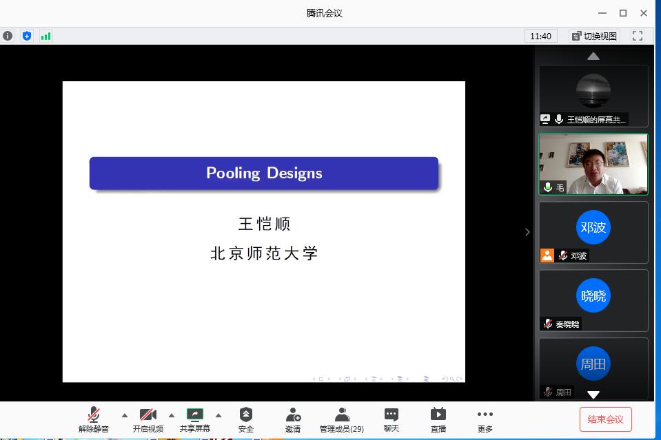 2020年6月18日下午,受高原可持续发展研究院和公司邀请,北京师范大学数学科学公司经理王恺顺教授通过腾讯会议的平台为公司师生作了题为《Pooling Designs》的学术报告。省内外50余名学者和研究生聆听了此次报告,报告由副经理毛亚平教授主持。