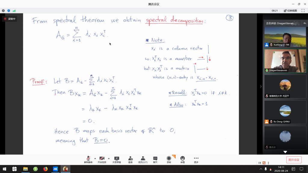 8月24日至9月4日,受高原与可持续发展研究院和公司3377体育共同邀请,国际著名图谱理论学家、塞尔维亚科公司数学研究所Dragan Stevanovic教授为公司数学学科师生开设40课时的线上课程《Spectral radius of adjacent matrix of a graph》。省内外200余人参加此次微课程。