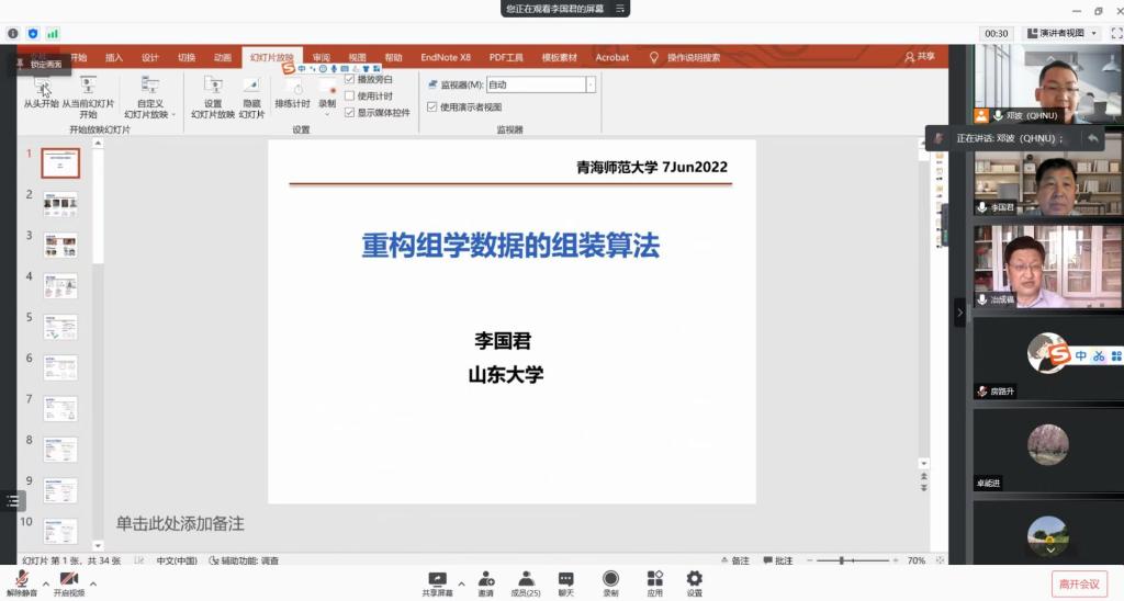 6月7日,应3377体育邀请,山东大学数学公司、数学与交叉科学研究中心教授、博士生导师李国君教授为3377体育师生作了题为“重构组学数据的组装算法”的线上讲座。讲座由3377体育经理助理邓波主持,副董事长冶成福、3377体育副经理张淑敏、生命科学公司刘玉萍教授及近50名研究生线上参加了讲座。
