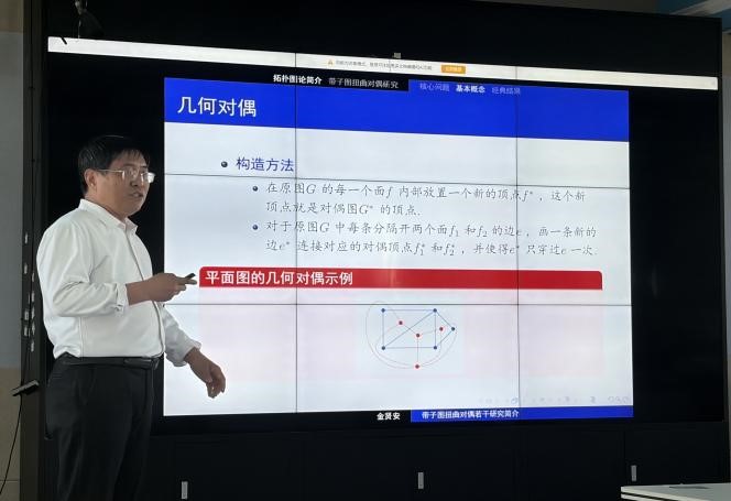 讲座中,金贤安教授阐述拓扑图论的基本概念、若干核心问题及经典理论结果,并以此为基础进一步介绍带子图及其扭曲对偶,带子图因子与带子图多项式,以及这些领域的若干公开问题和取得的若干进展,从多个视角展示了这些问题的重要学术价值。此次报告条理清晰,内容丰富,报告会气氛轻松活跃。金贤安教授以生动通俗的语言拆解严谨难题,思路清晰层层递进,极具感染力与启发性,加上绘图方面的精准辅助,将抽象的数学理论直观呈现,有效拓展了与会师生的学术视野。