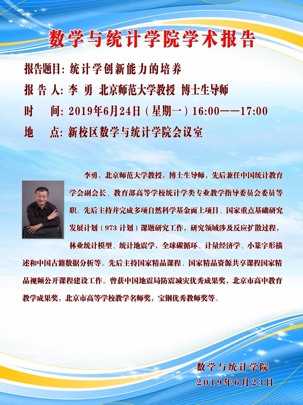 讲座:6月24日 统计学创新能力的培养