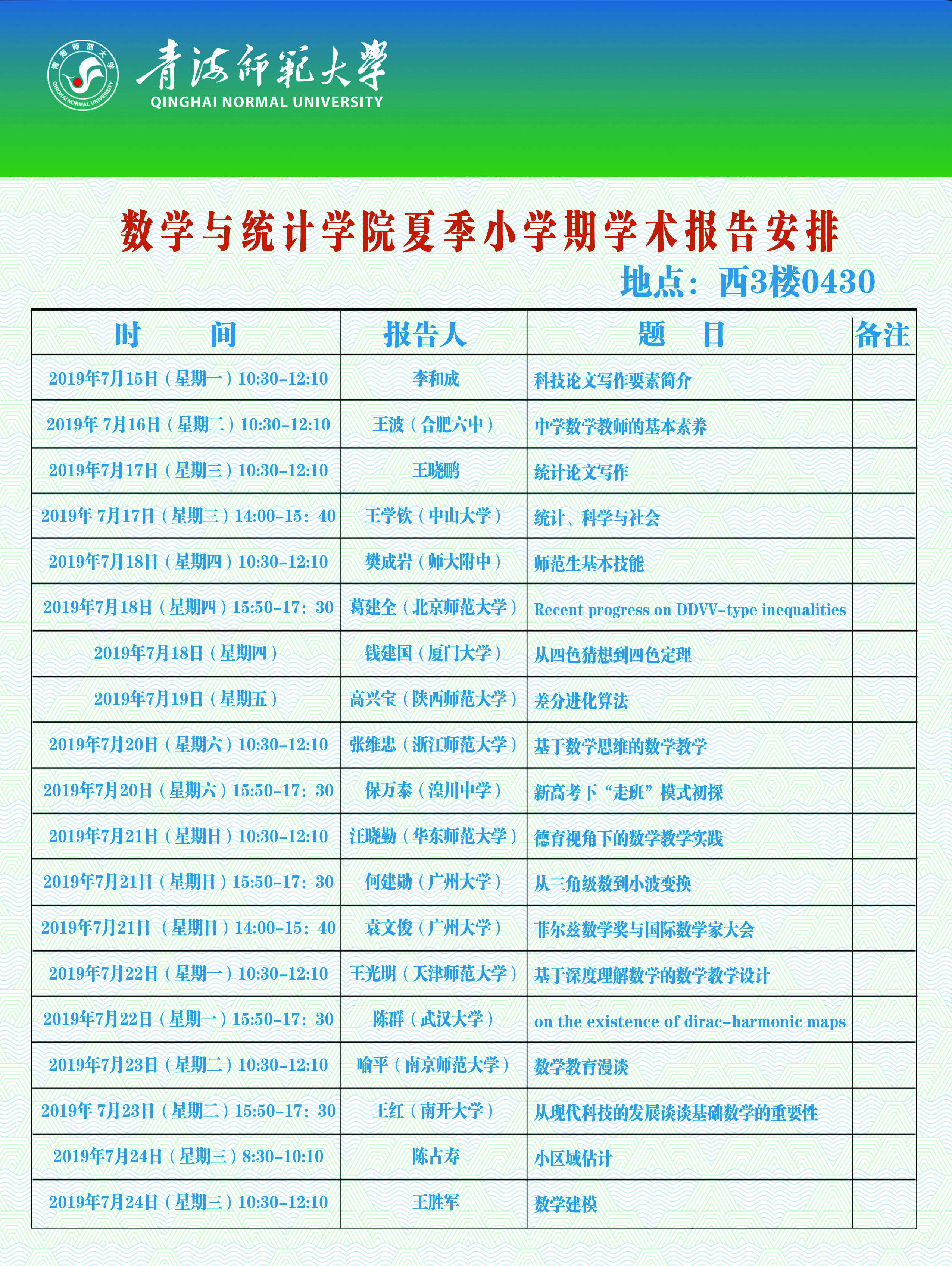 讲座:7月15日-24日 2019年3377体育夏季小学期学术报告安排