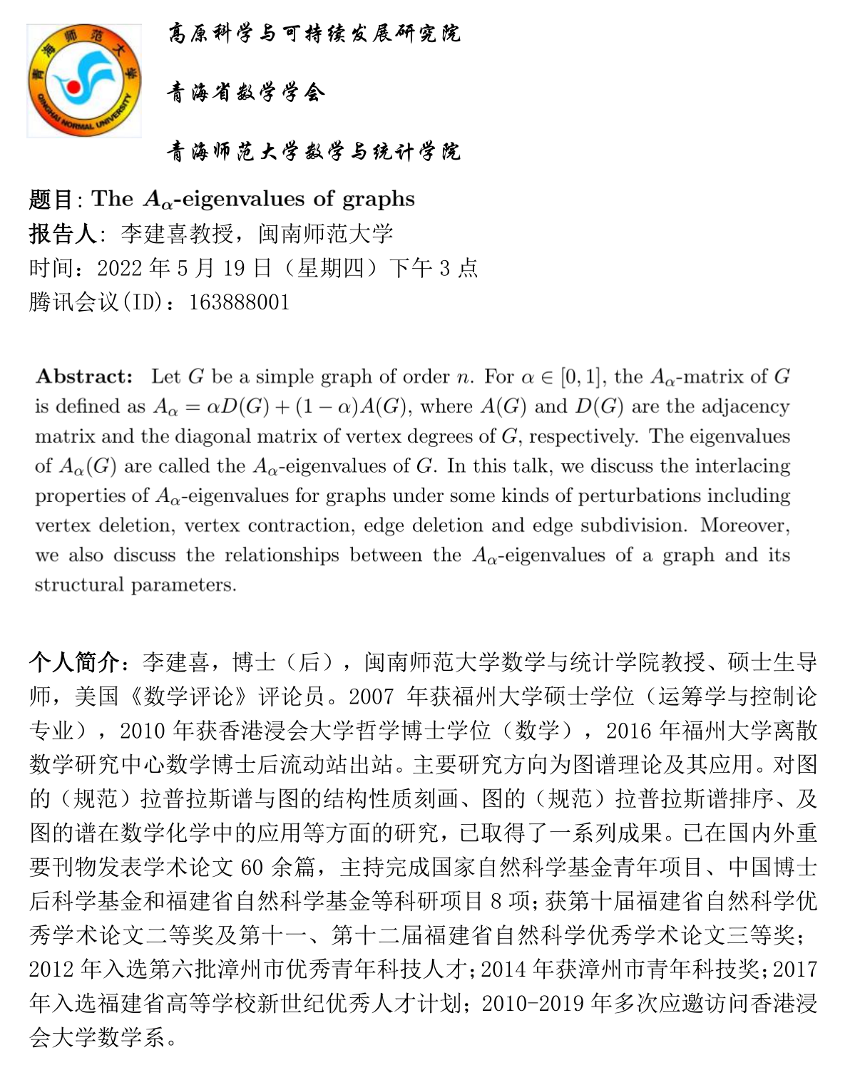 讲座(在线):5月19日 李建喜 The Aα-eigenvalues of graphs