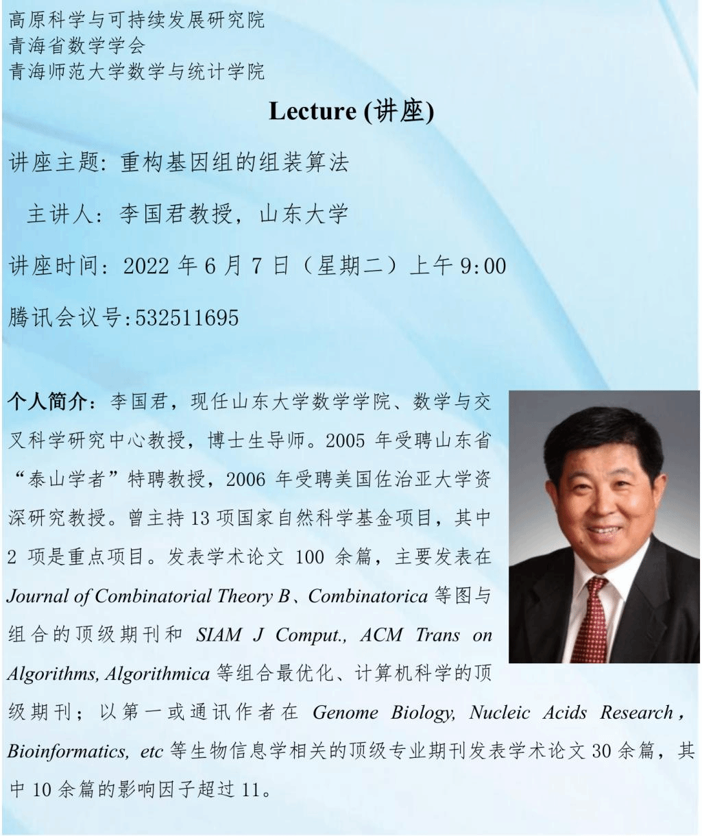 讲座(在线):6月7日 李国君 重构组学数据的组装算法