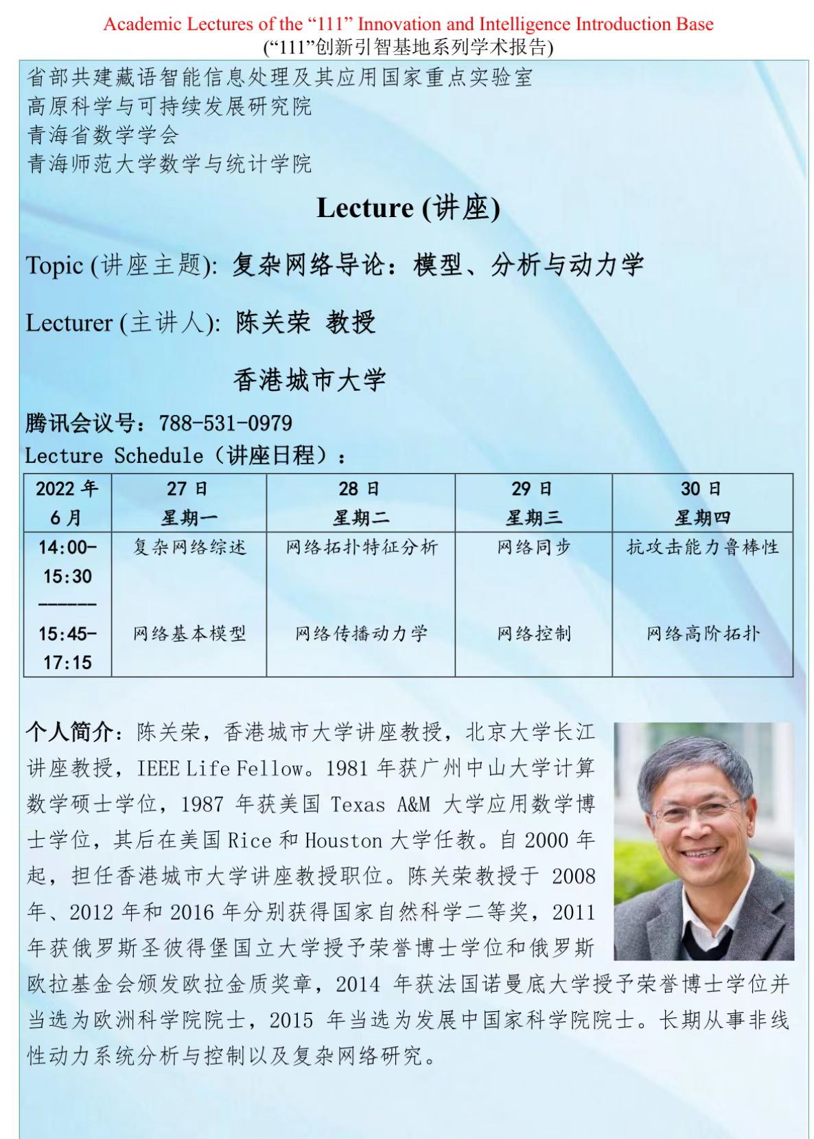 系列讲座(在线):6月27-30日 陈关荣 复杂网络导论:模型、分析与动力学