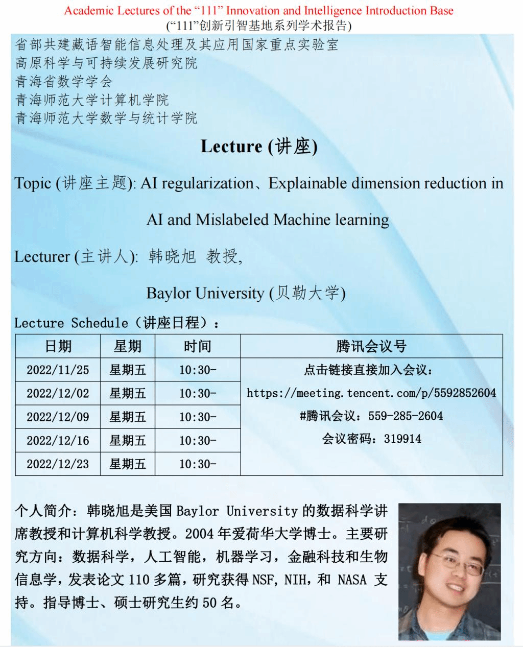 系列讲座(在线):11月25日-12月23日 韩晓旭 AI regularization...