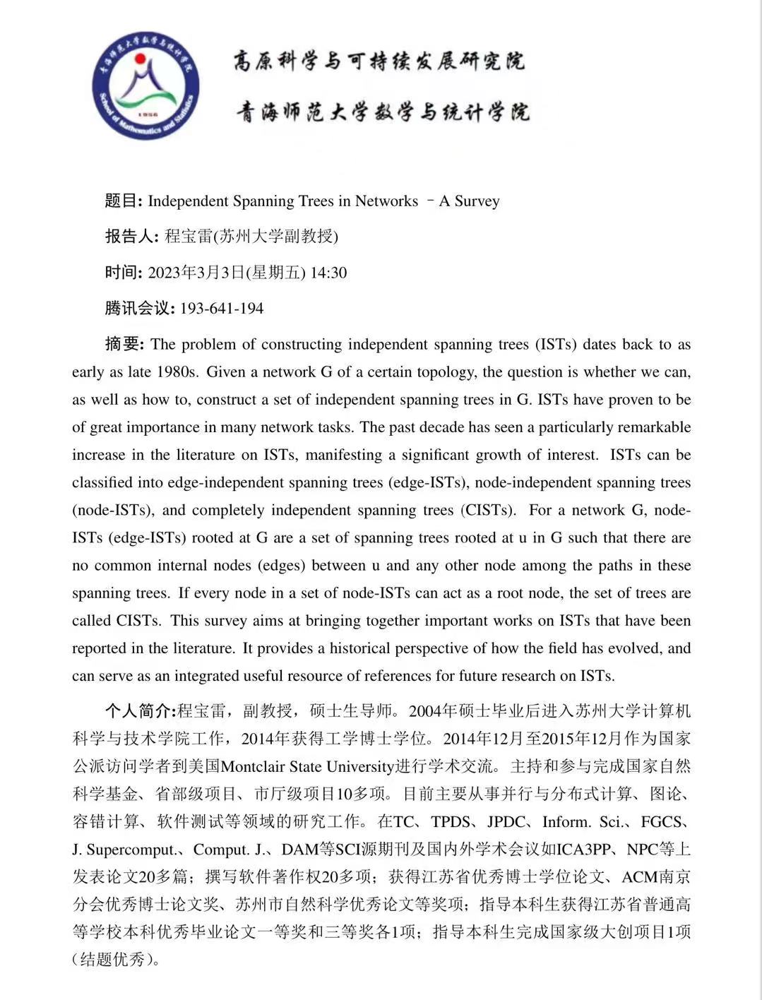 讲座(在线):3月3日 程宝雷 Independent Spanning Trees in Networks -A Survey