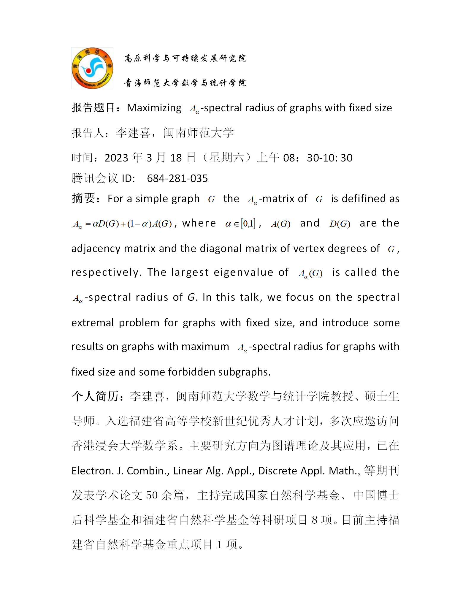 讲座(在线):3月18日 李建喜 Maximizing A_\alpha-spectral radius of graphs with fixed size