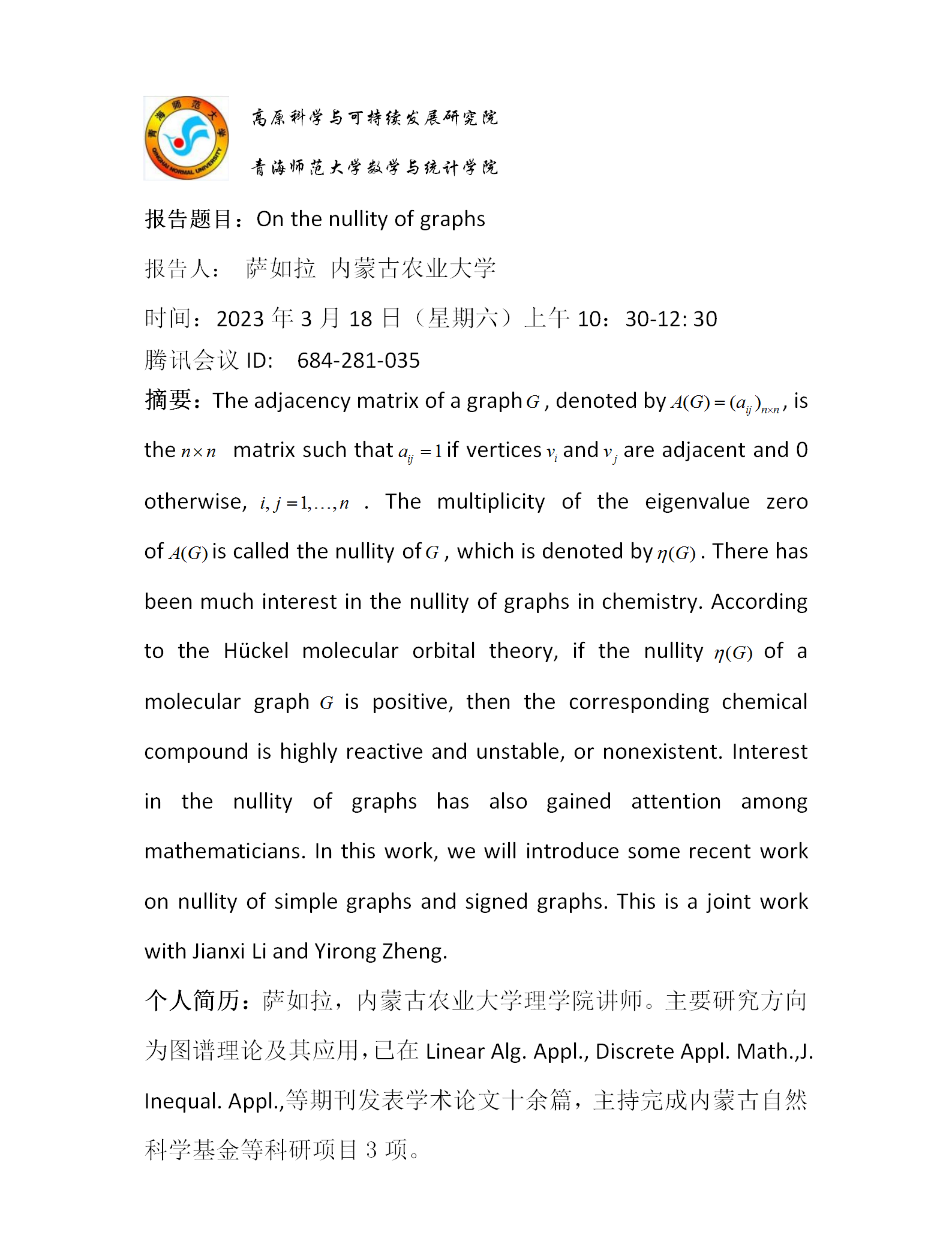 讲座(在线):3月18日 萨如拉 On the nullity of graphs