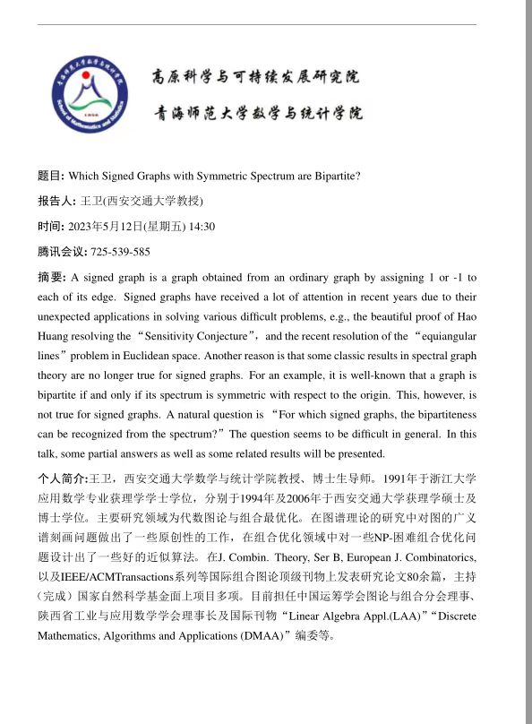 讲座(在线):5月12日 王卫 Which signed graphs with symmetric spectrum are bipartite?
