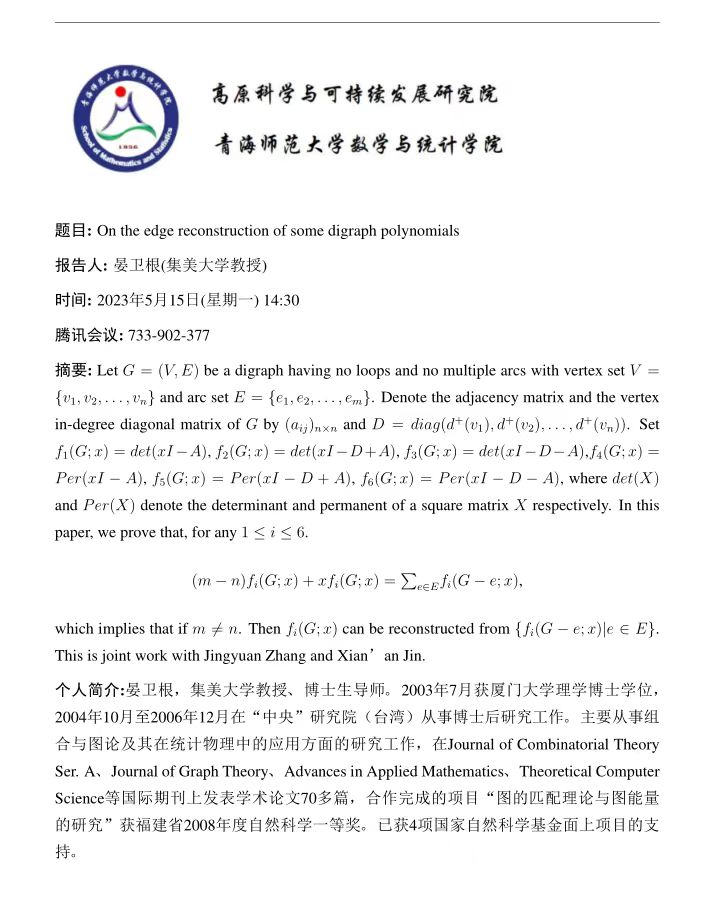 讲座(在线):5月15日 晏卫根 On the edge reconstruction of some digraph polynomials