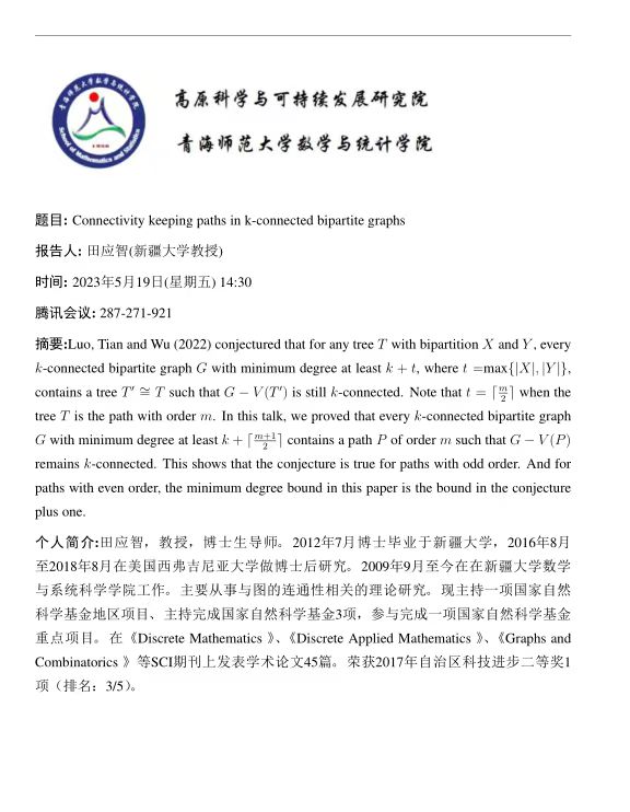 讲座(在线):5月19日 田应智 Connectivity keeping paths in k-connected bipartite graphs