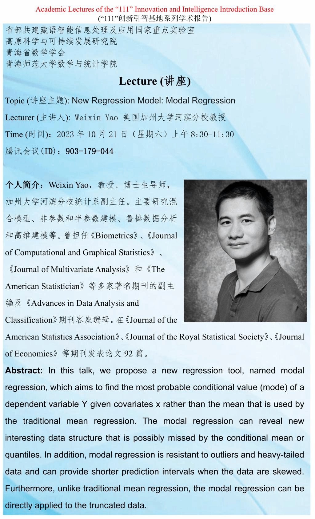 讲座(在线):10月21日 Weixin Yao New Regression Model: Modal Regression