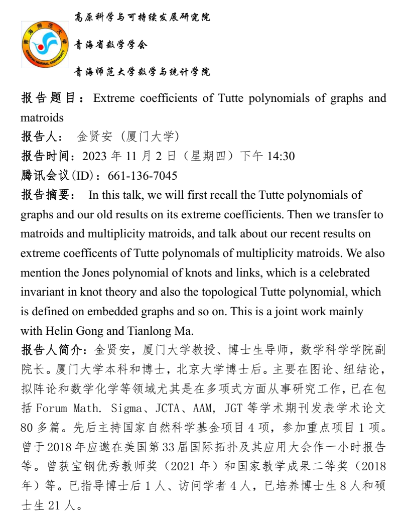 讲座(在线):11月2日 金贤安 Exterme coefficients of Tutte polynomials of graphs and matroids