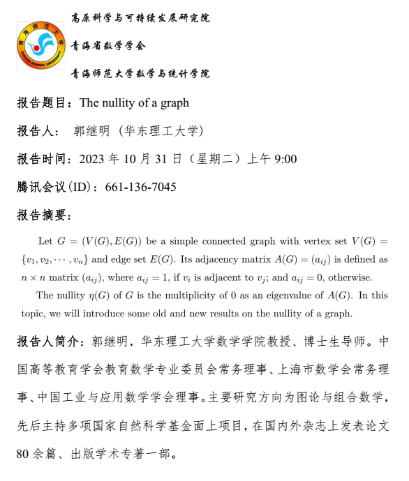 讲座(在线):10月31日 郭继明 The nullity of a graph