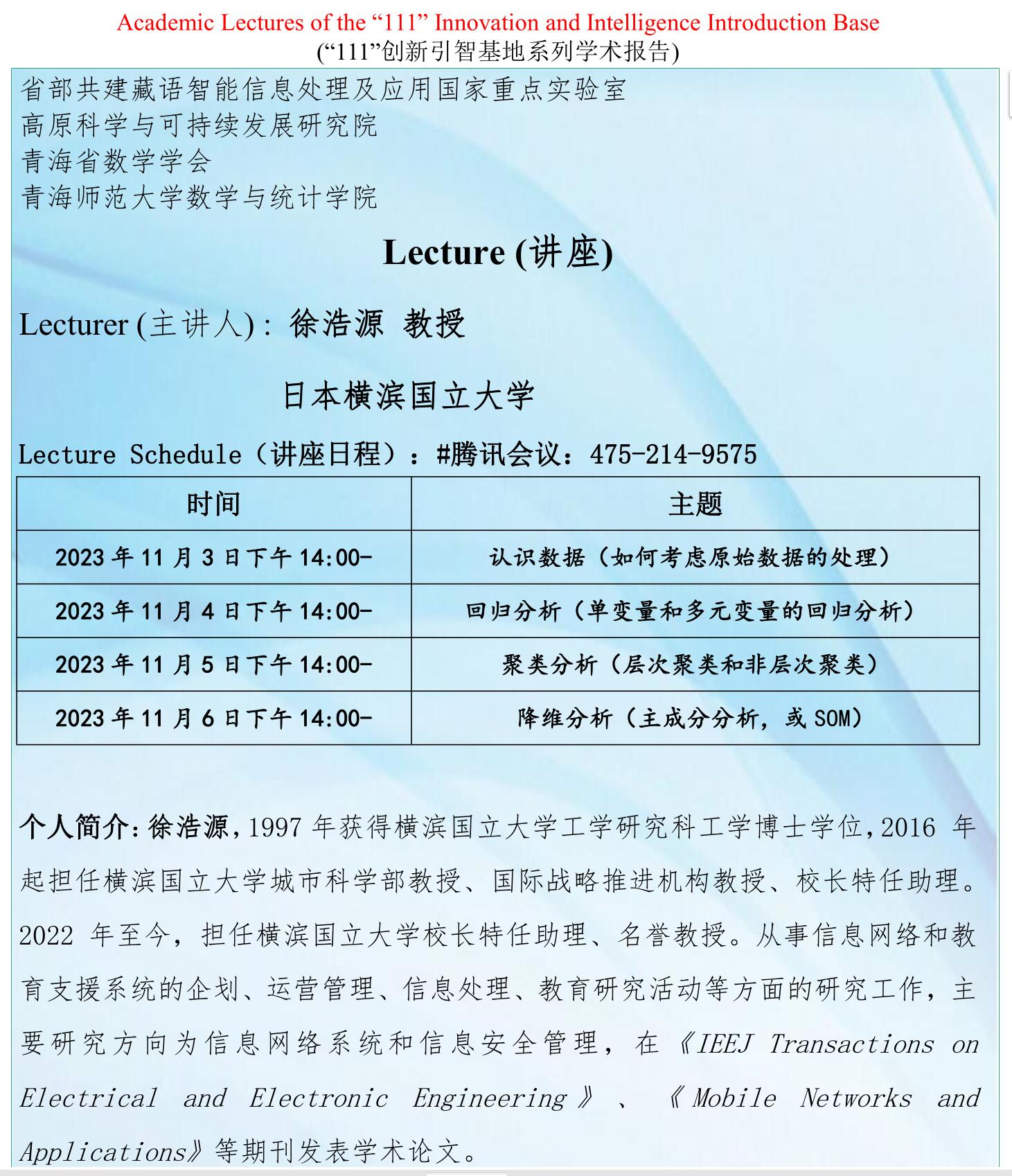 系列讲座(在线):11月3日-6日 徐浩源 认识数据,回归分析,聚类分析,降维分析