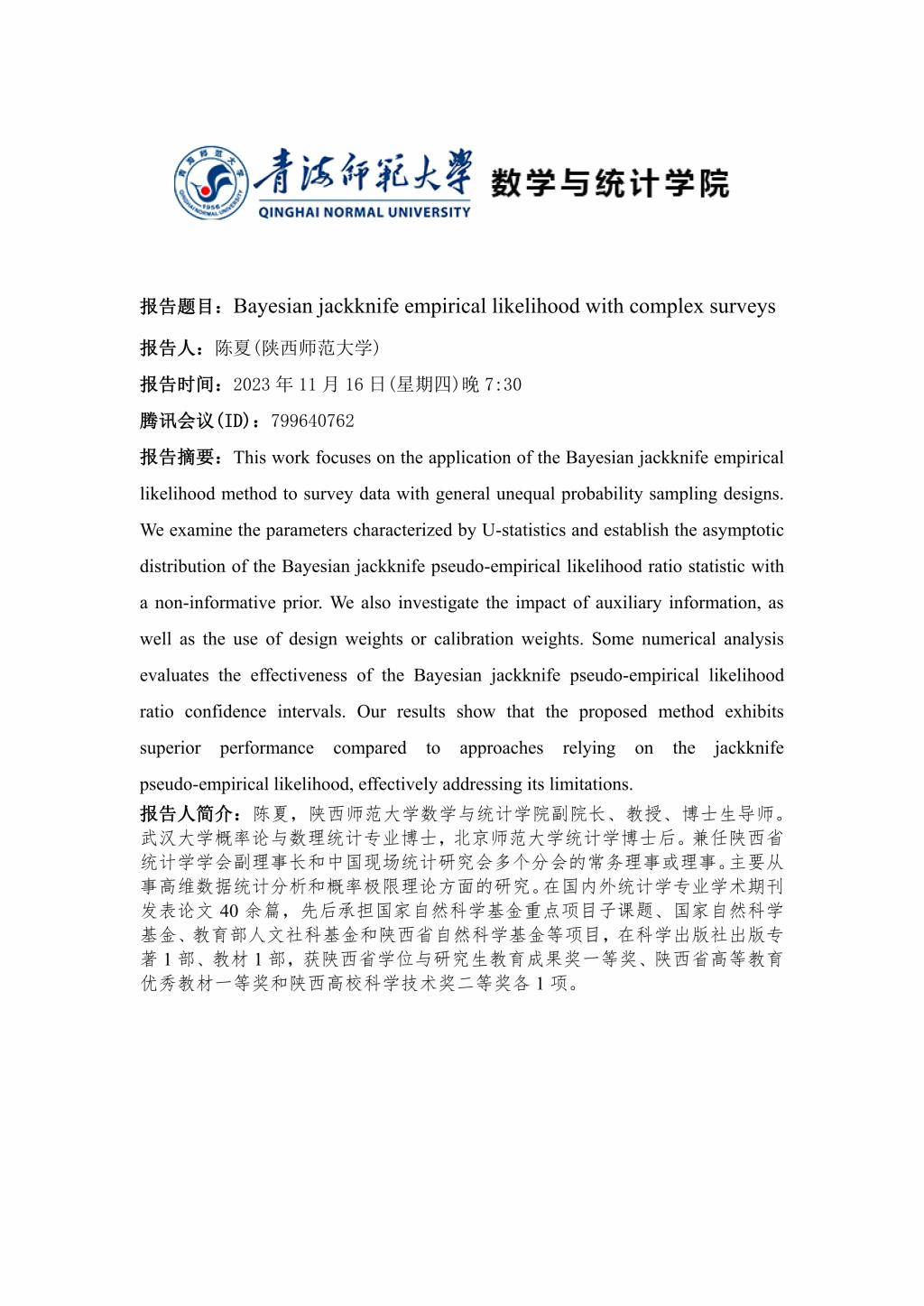 讲座(在线):11月16日 陈夏 Bayesian jackknife empirical likelihood with complex surveys