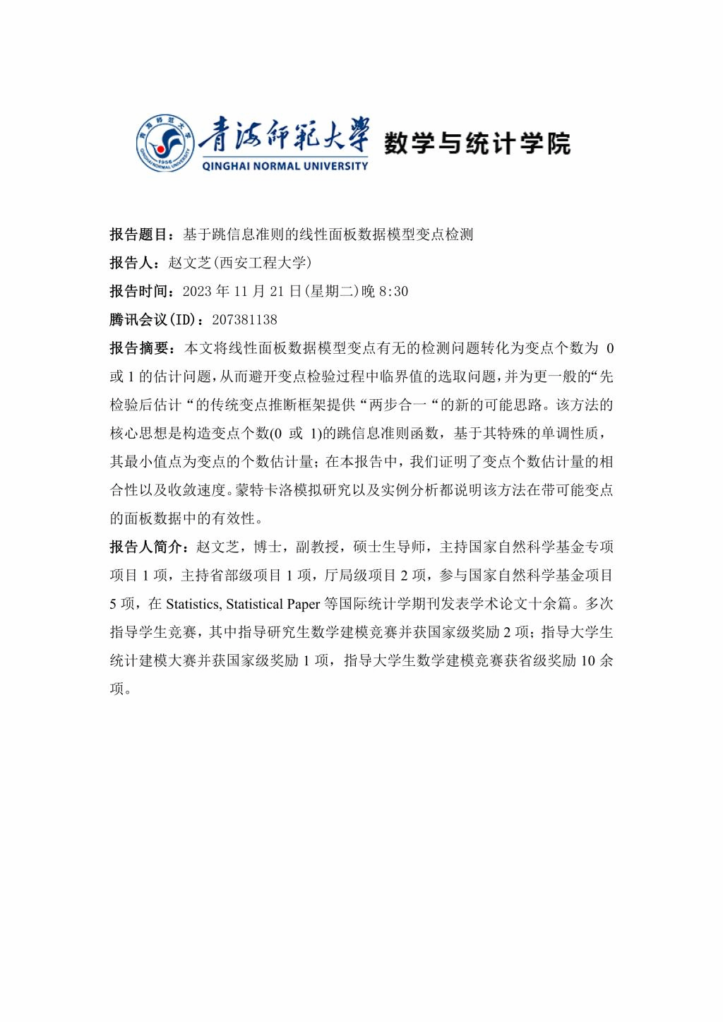 讲座(在线):11月21日 赵文芝 基于跳信息准则的线性面板数据模型变点检测