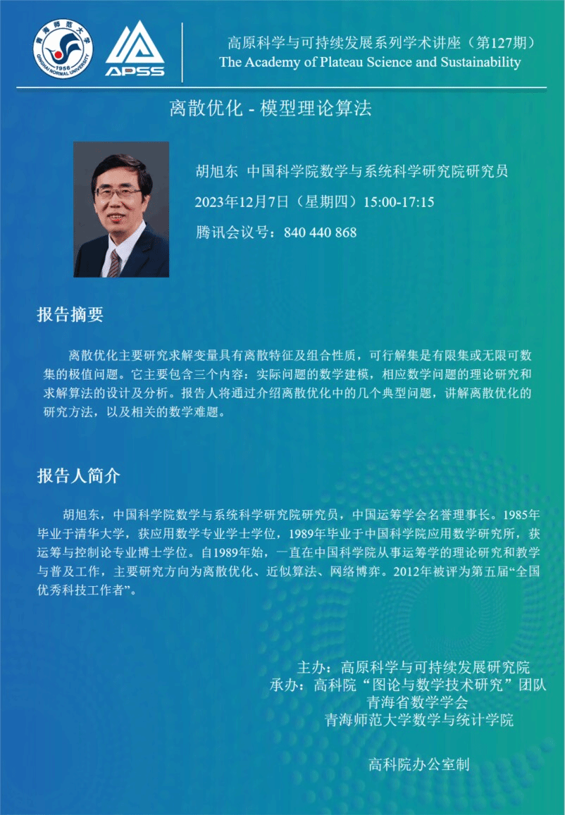 讲座(在线):12月7日 胡旭东 离散优化-模型理论算法
