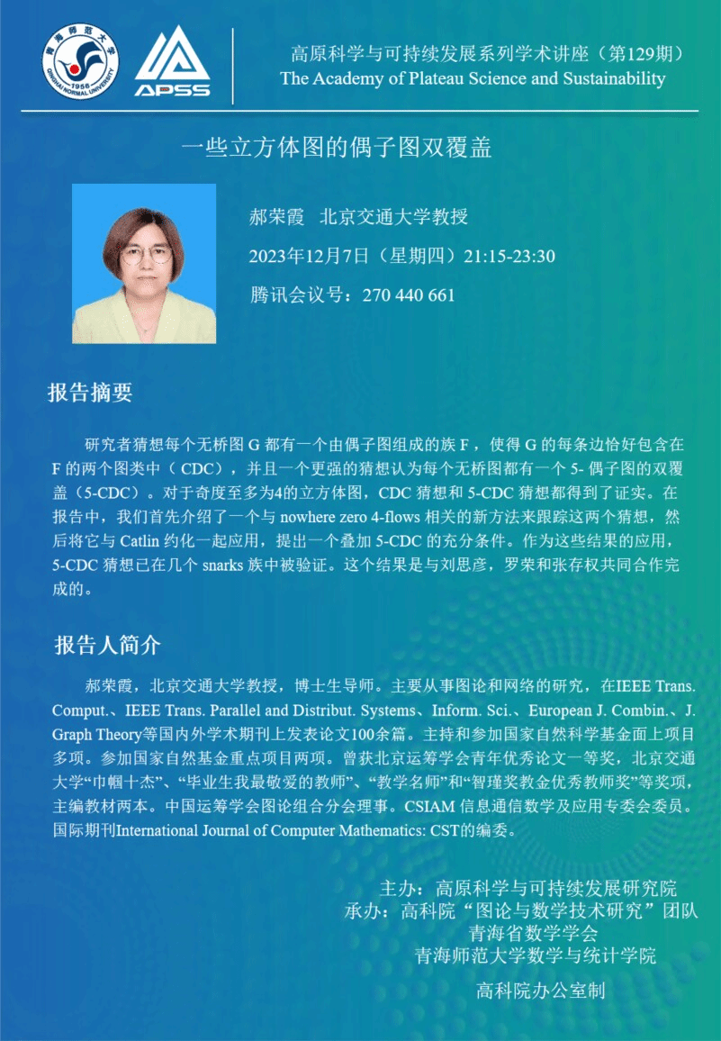 讲座(在线):12月7日 郝荣霞 一些立方体图的偶子图双覆盖