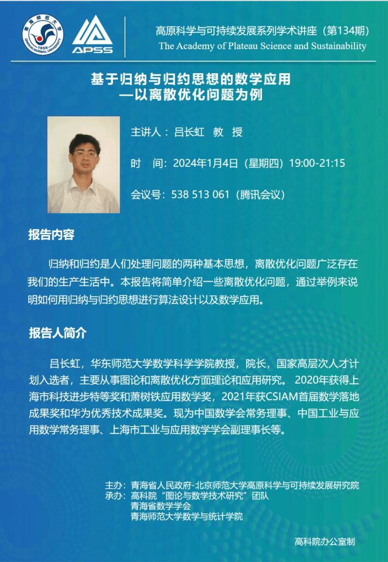 讲座(在线):1月4日 吕长虹 基于归纳与归约思想的数学应用—以离散优化问题为例