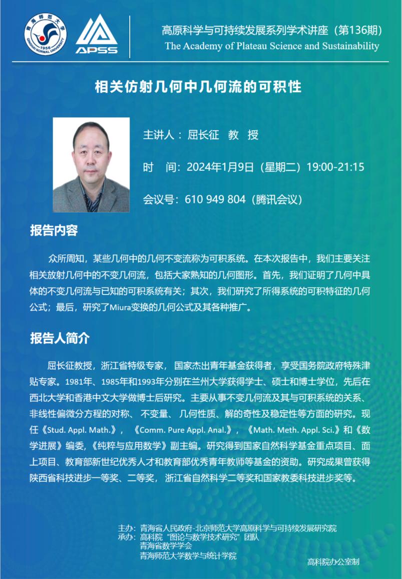 讲座(在线):1月9日 屈长征 相关仿射几何中几何流的可积性