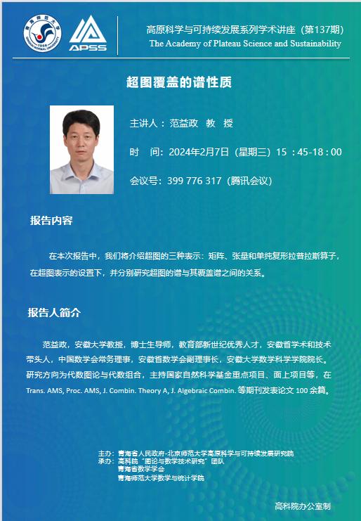 讲座(在线):2月7日 范益政 超图覆盖的谱性质