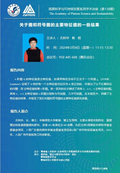 讲座(在线):3月4日 尤利华 关于图和符号图的主要特征值的一些结果