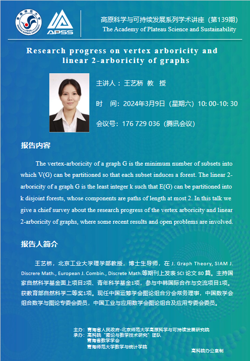讲座(在线):3月9日 王艺桥 图的顶点荫度和线性-2荫度的研究进展