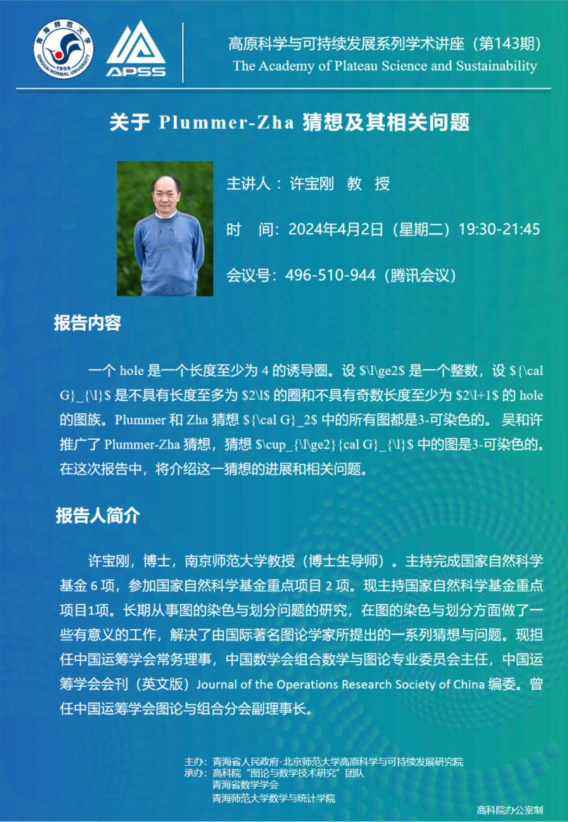 讲座(在线):4月2日 许宝刚 关于 Plummer-Zha 猜想及其相关问题