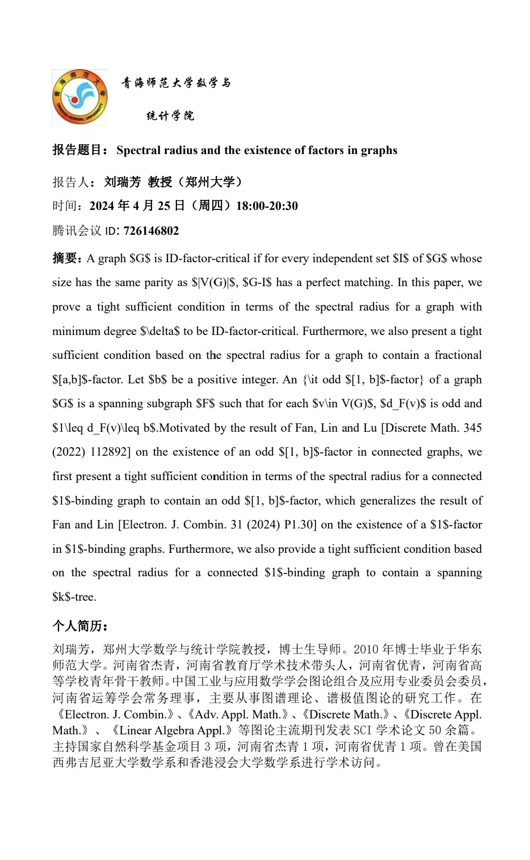 讲座(在线):4月25日 刘瑞芳 Spectral radius and the existence of factors in graphs