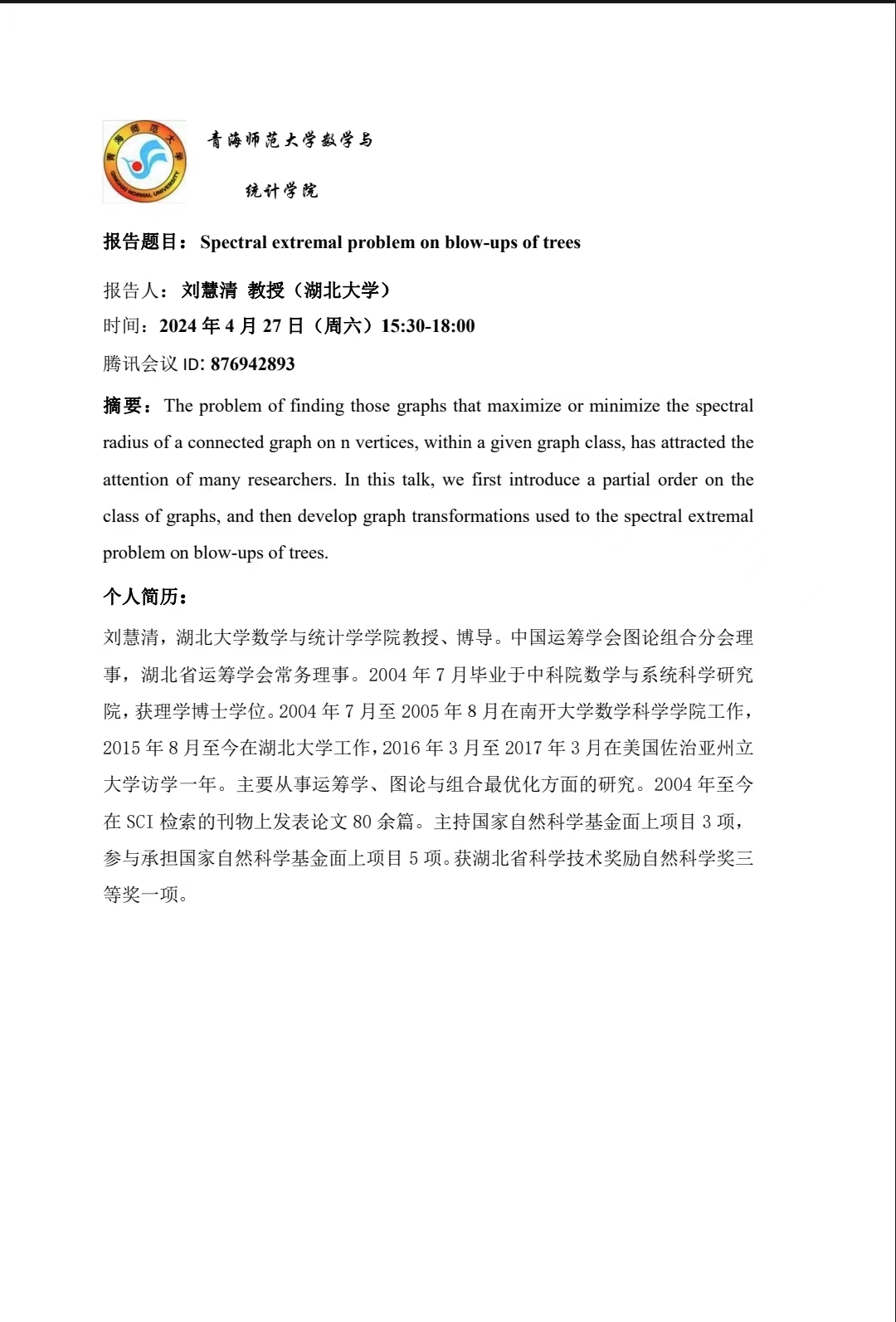 讲座(在线):4月27日 刘慧清 Spectral extremal problem on blow-ups of trees