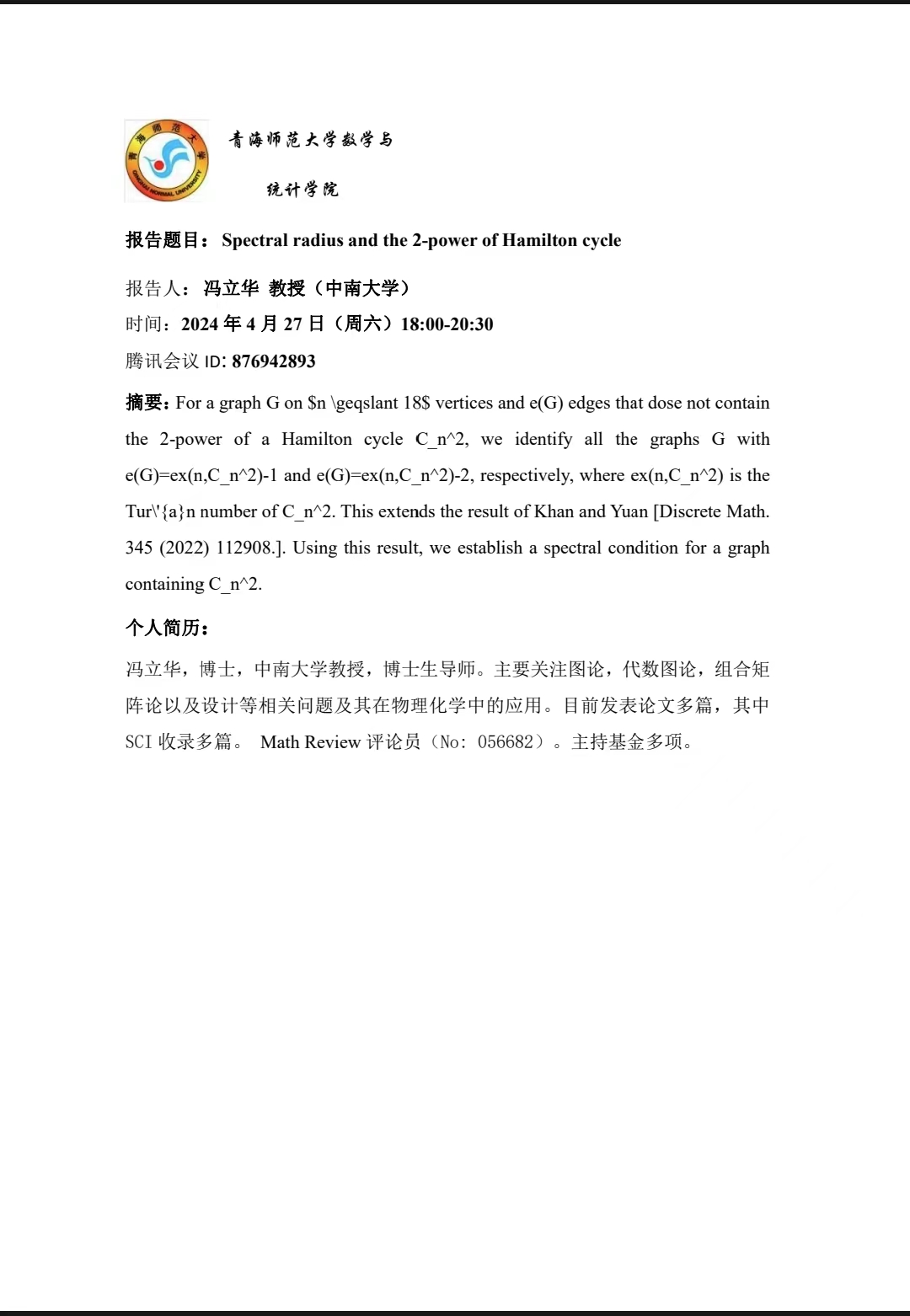 讲座(在线):4月27日 冯立华 Spectral radius and the 2-power of Hamilton cycle