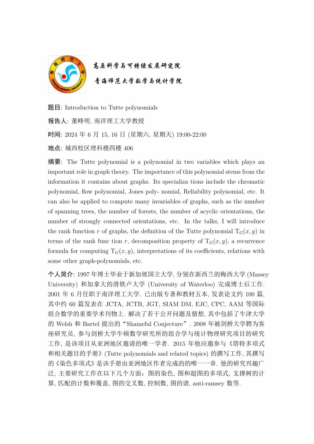 讲座:6月15-16日 董峰明 Introduction to Tutte polynomials