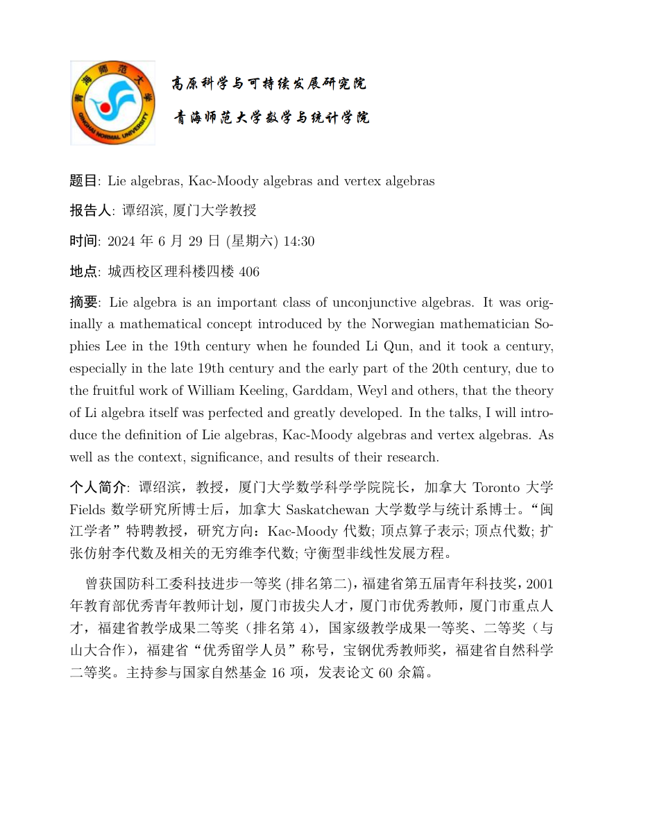 讲座(线下):6月29日 谭绍滨 Lie algebras, Kac-Moody algebras and vertex algebras
