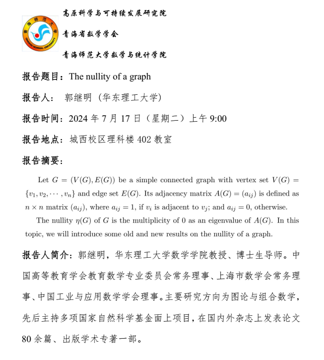 讲座(在线):7月17日 郭继明 The nullity of a graph