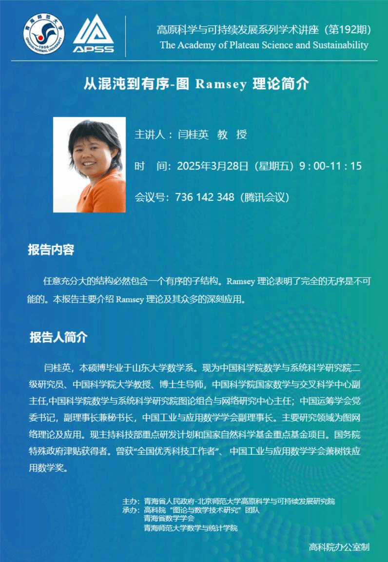 讲座(在线):3月28日 闫桂英 从混沌到有序-图Ramsey理论简介