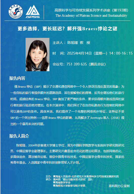 讲座(在线):4月14日 陈旭瑾 更多选择,更长延迟?解开强Braess悖论之谜