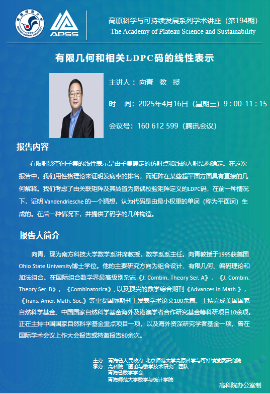 讲座(在线):4月16日 向青 有限几何和相关LDPC码的线性表示