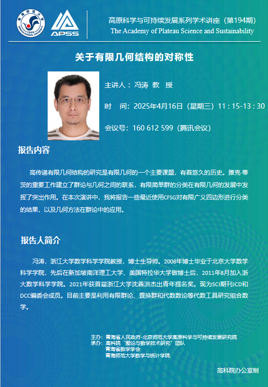 讲座(在线):4月16日 冯涛 关于有限几何结构的对称性