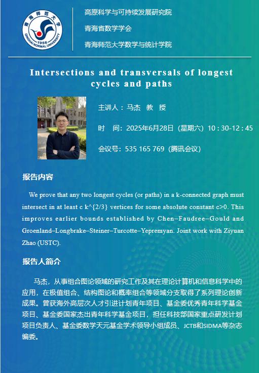 讲座(在线):6月28日 马杰 Intersections and transversals of longest cycles and paths