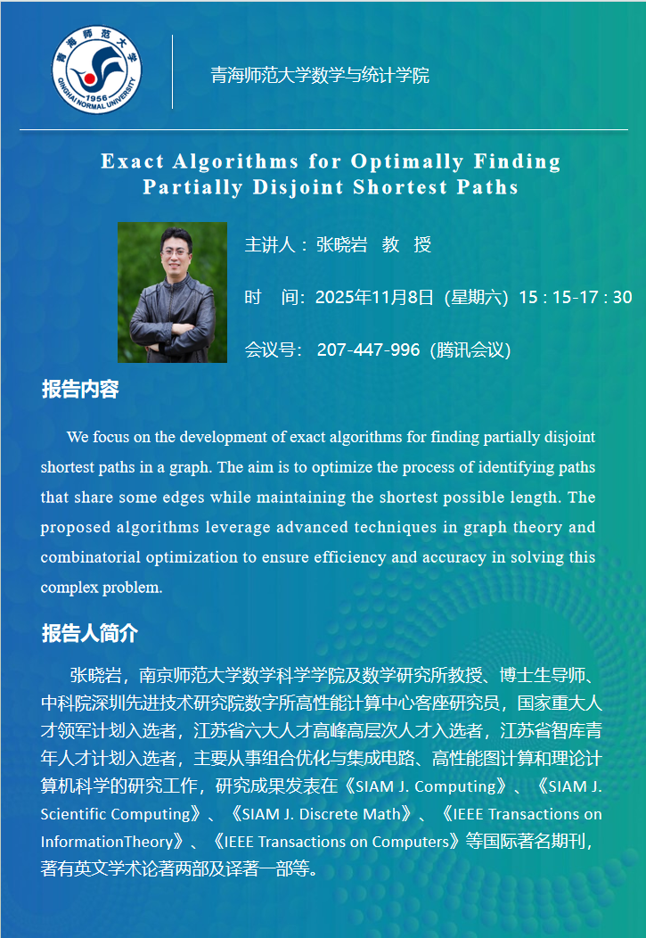 讲座(在线):11月8日 张晓岩 Exact Algorithms for Optimally Finding Partially Disjoint Shortest Paths