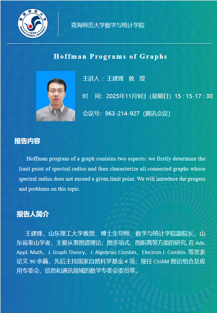 讲座(在线):11月9日 王建锋 Hoffman Programs of Graphs
