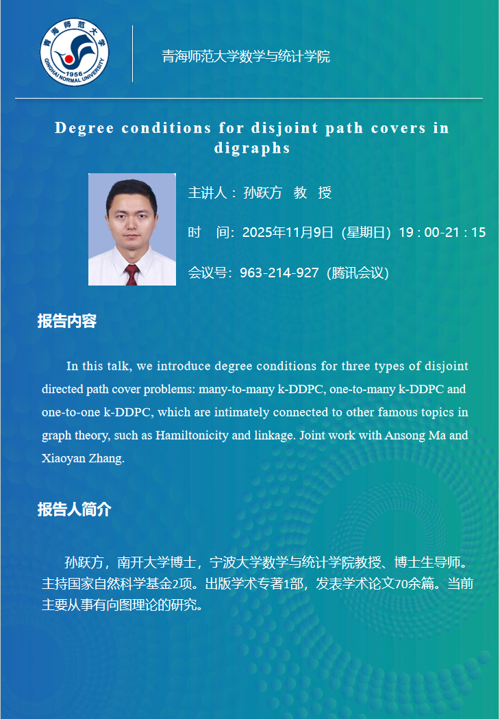 讲座(在线):11月9日 孙跃方 Degree conditions for disjoint path covers in digraphs