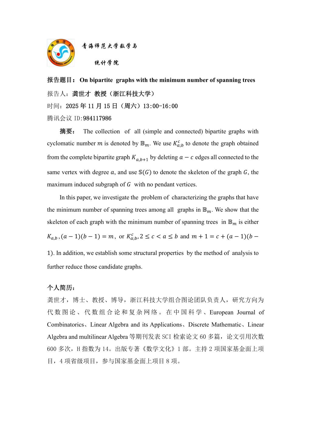 讲座(在线):11月15日 龚世才 On bipartite graphs with the minimum number of spanning trees
